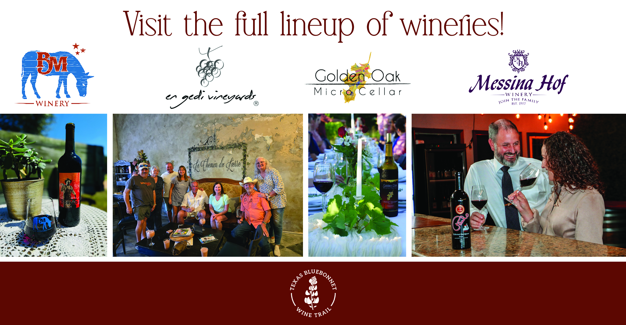 Come thirsty. Leave inspired. This is your Texas Bluebonnet Wine Trail.